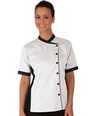 Cuello siluetado con cuello mao, cruce doble, axila transpirante, bolsa tipo parche en manga.